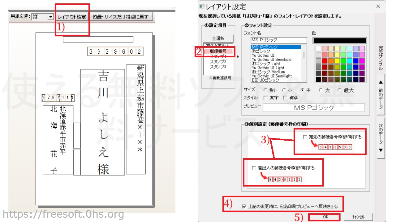 「二刀流宛名印刷」の郵便番号の印刷位置は変更することもできる。