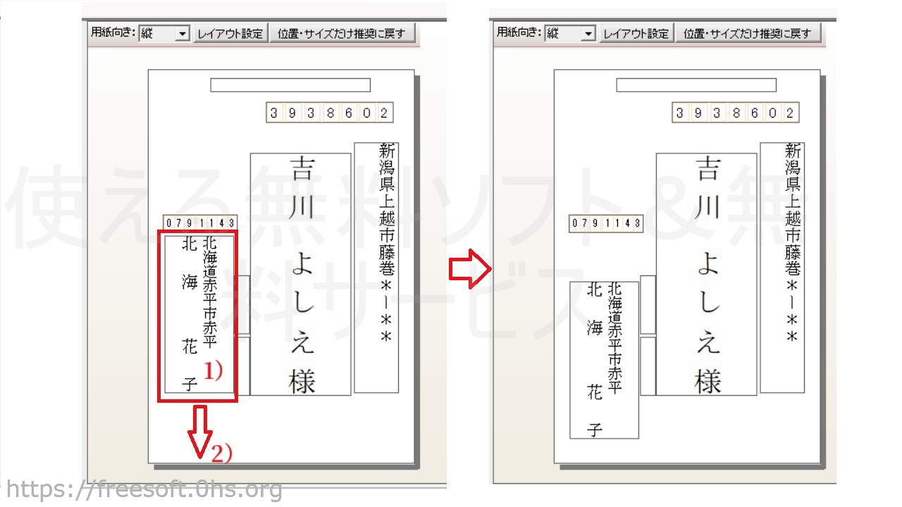 宛先の住所や氏名も同じように位置を動かすことができる。