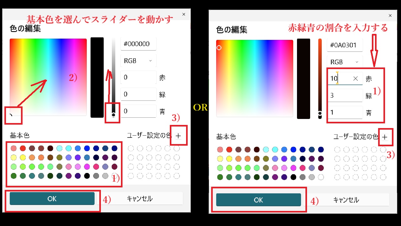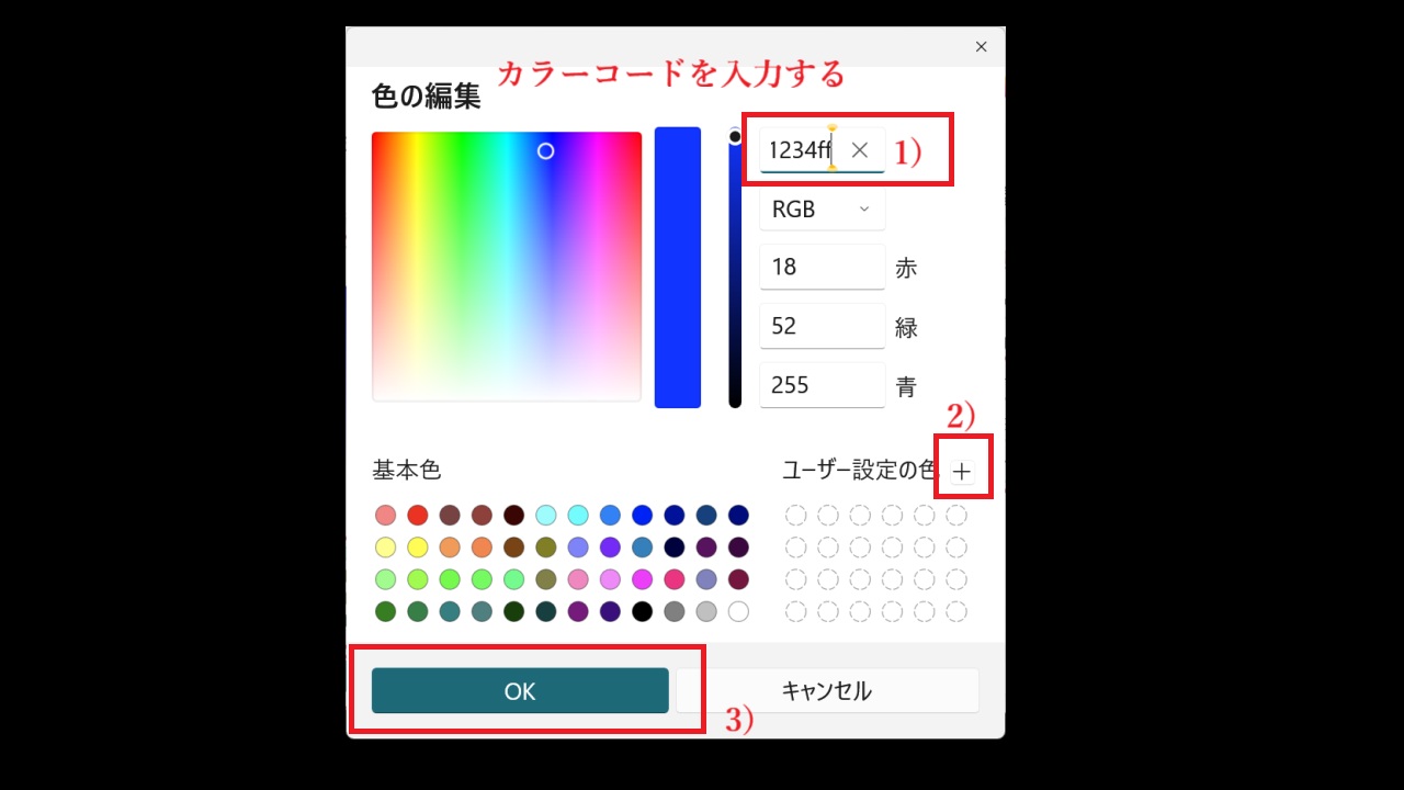 2-2-①)赤緑青の欄に数字を入力して色を指定する