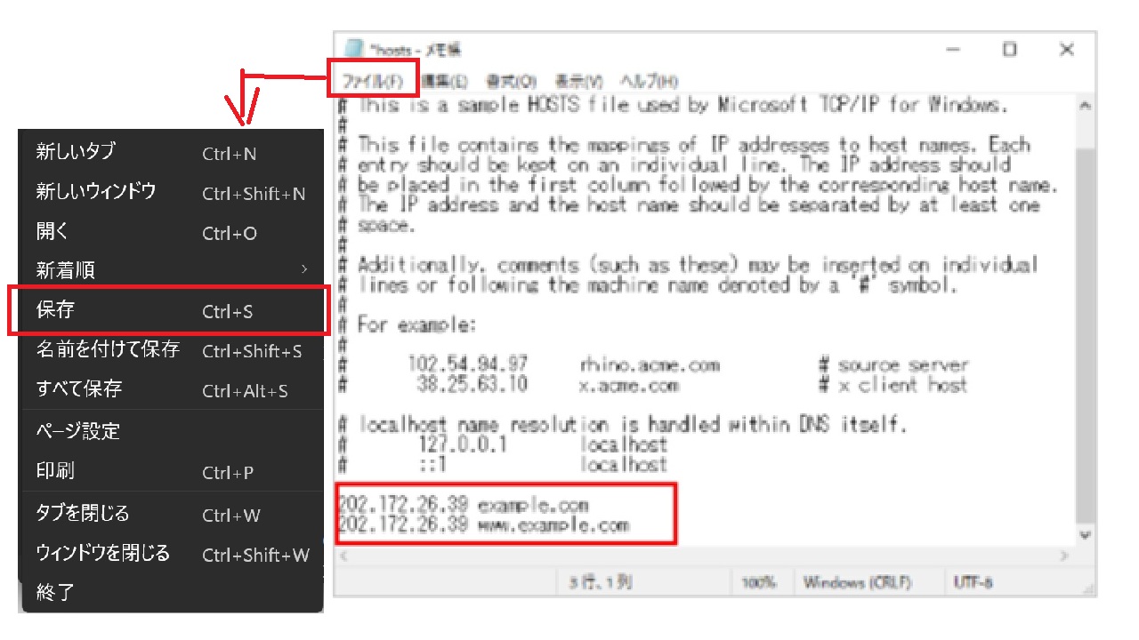 8.表示確認が済んだら、メモ帳に追記した部分を削除して、再度、〔ファイル〕→〔上書き保存(又は保存)〕を押して元のhostsファイルを保存する。