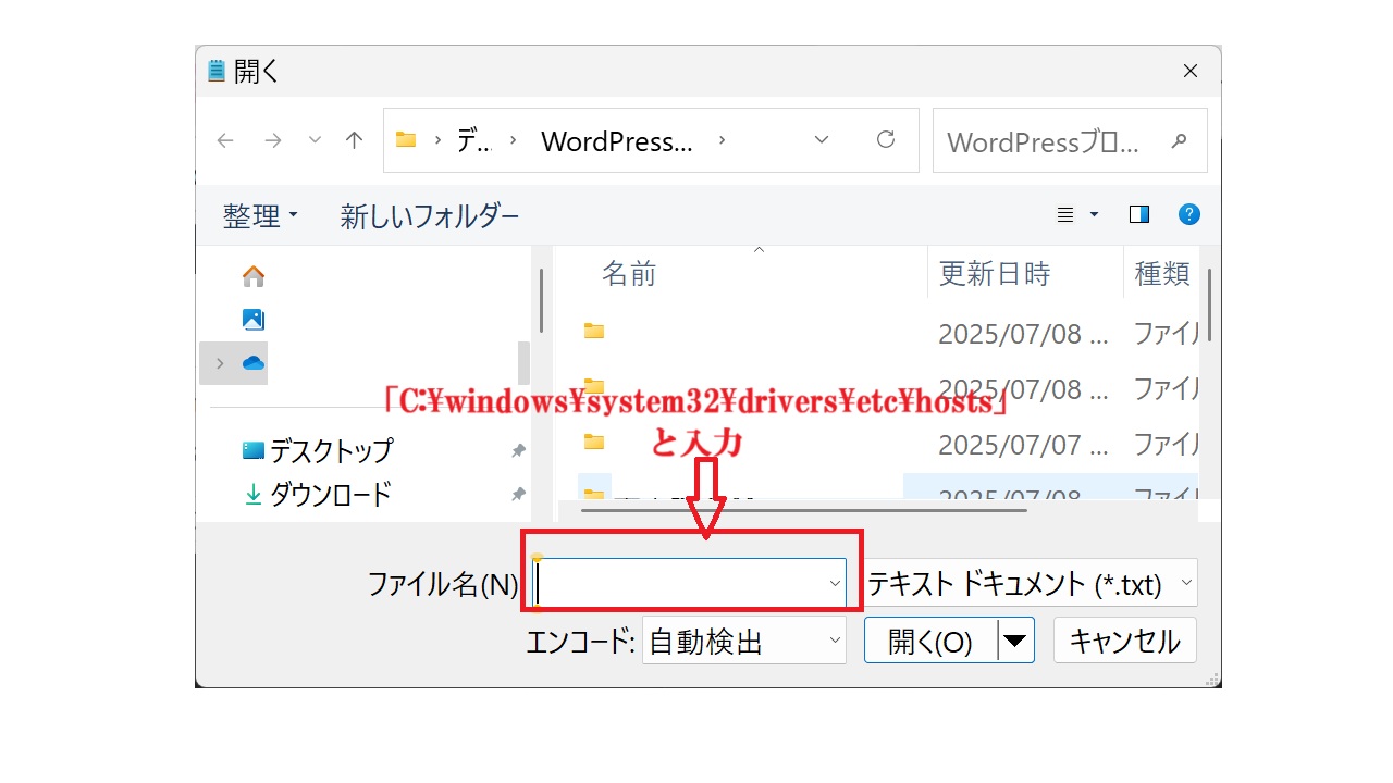 5.ファイル名欄に「C:\windows\system32\drivers\etc\hosts」と入力して「開く」を押す。