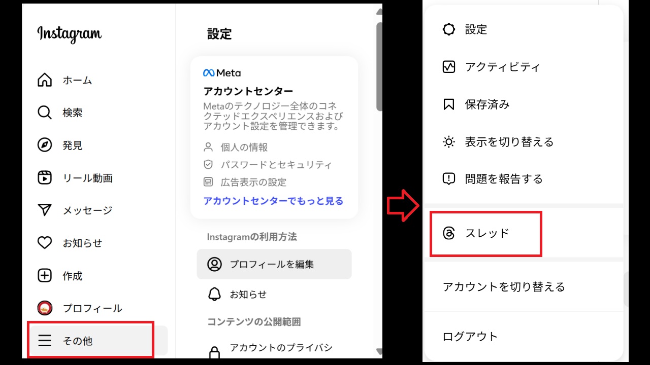 1インスタグラムの【その他】を押し、〔threads〕を押す-threadsの登録