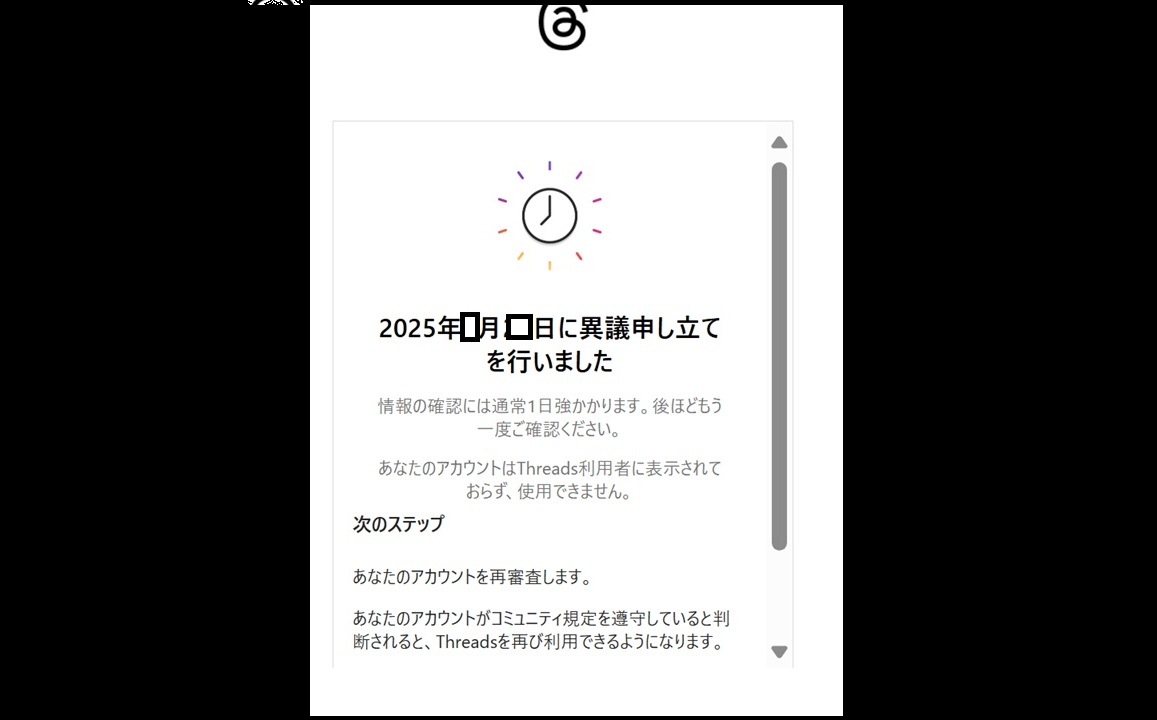 「異議申し立てを行いました」という画面が出てくる-threadsの登録