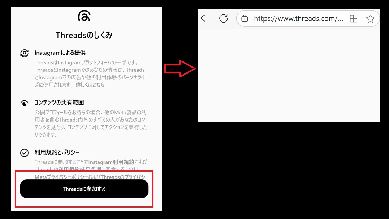 ThreadsはX(旧ツイッター)に近い形のSNSだが、登録の仕方が独特。
