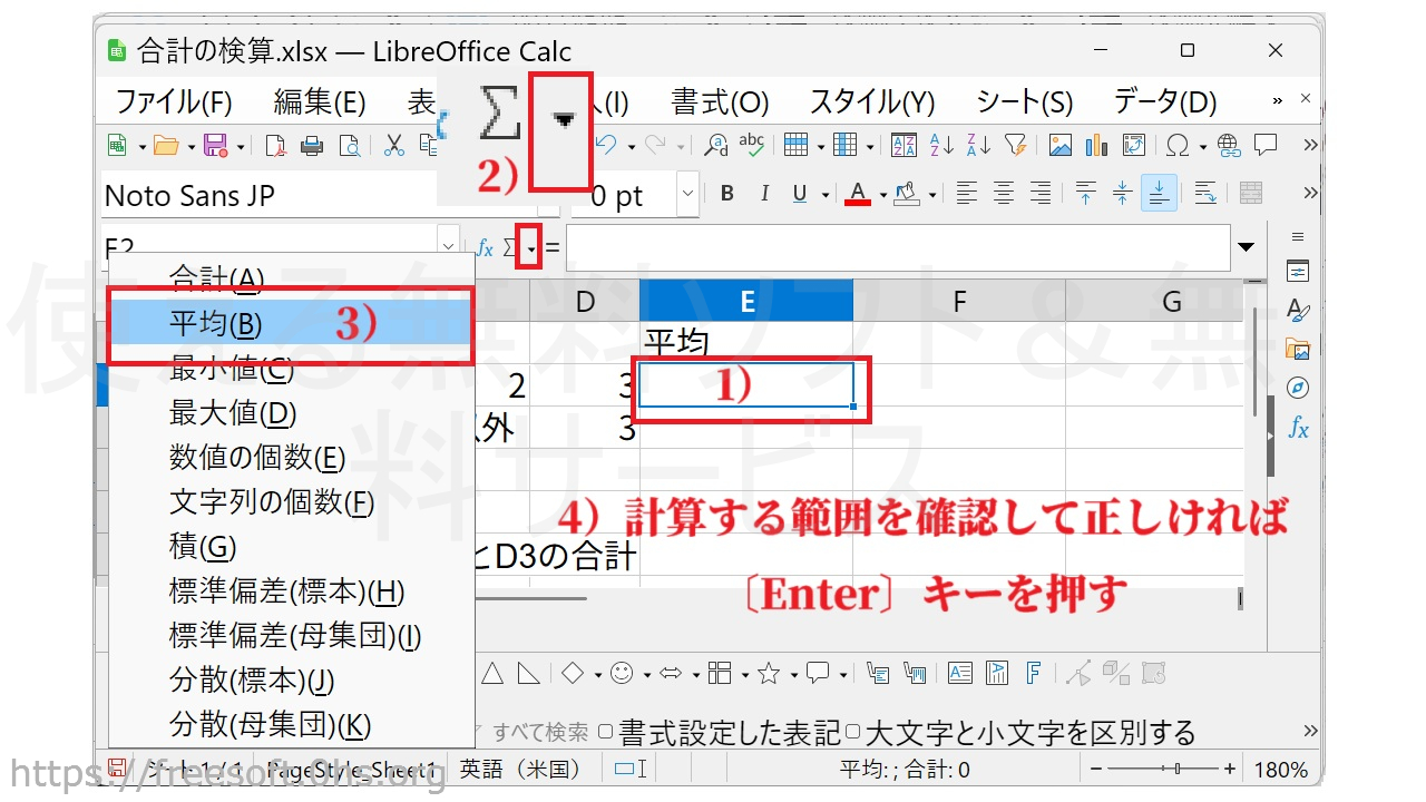 LibreOfficeCalcの【Σ▼】ボタンは合計値・平均値・最大値・最小値・積・偏差・分布などいろいろな計算ができるのじゃ。