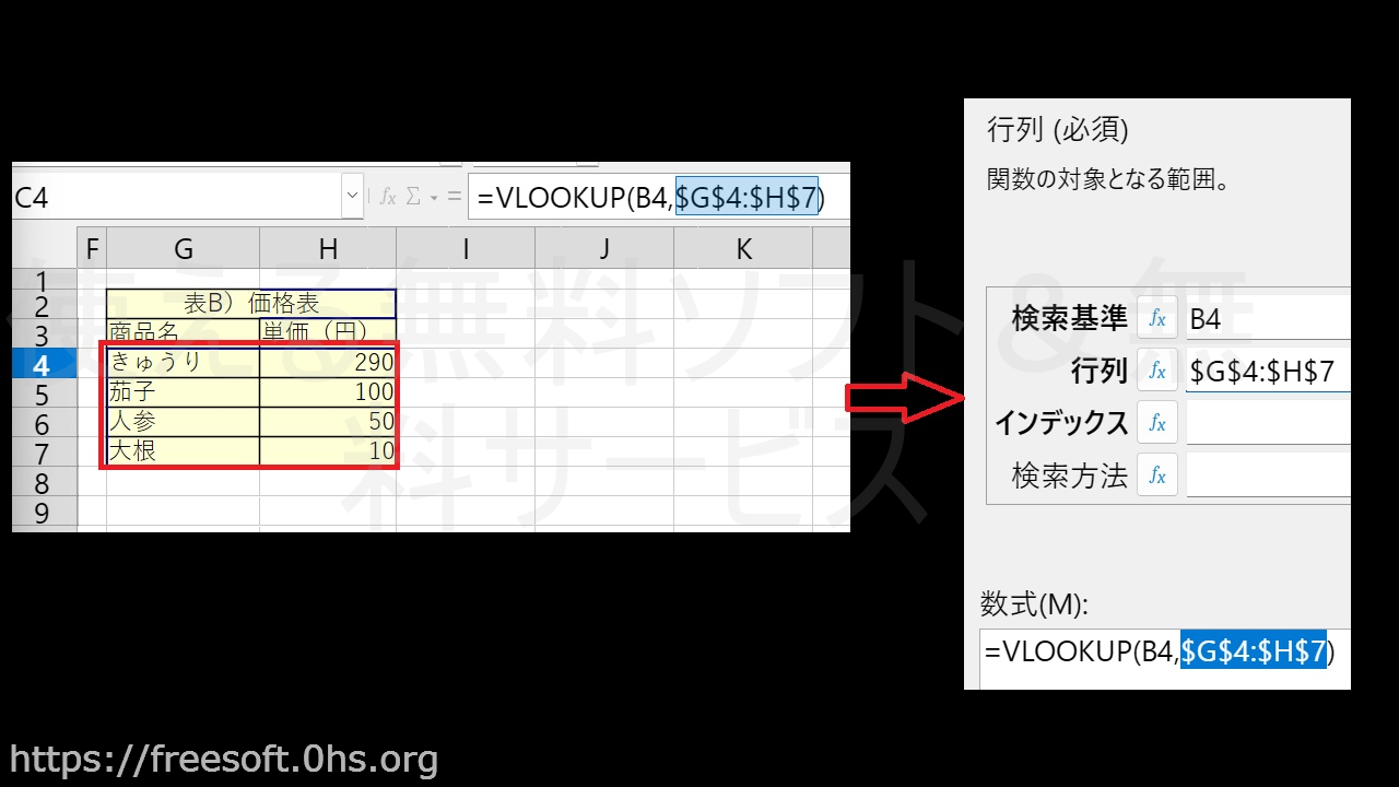 数式は「=VLOOKUP(B4,$G$4:$H$7,2,0)」という形になる。