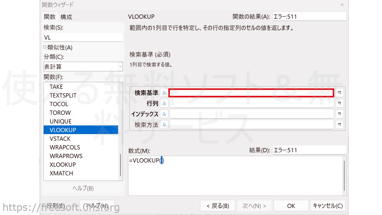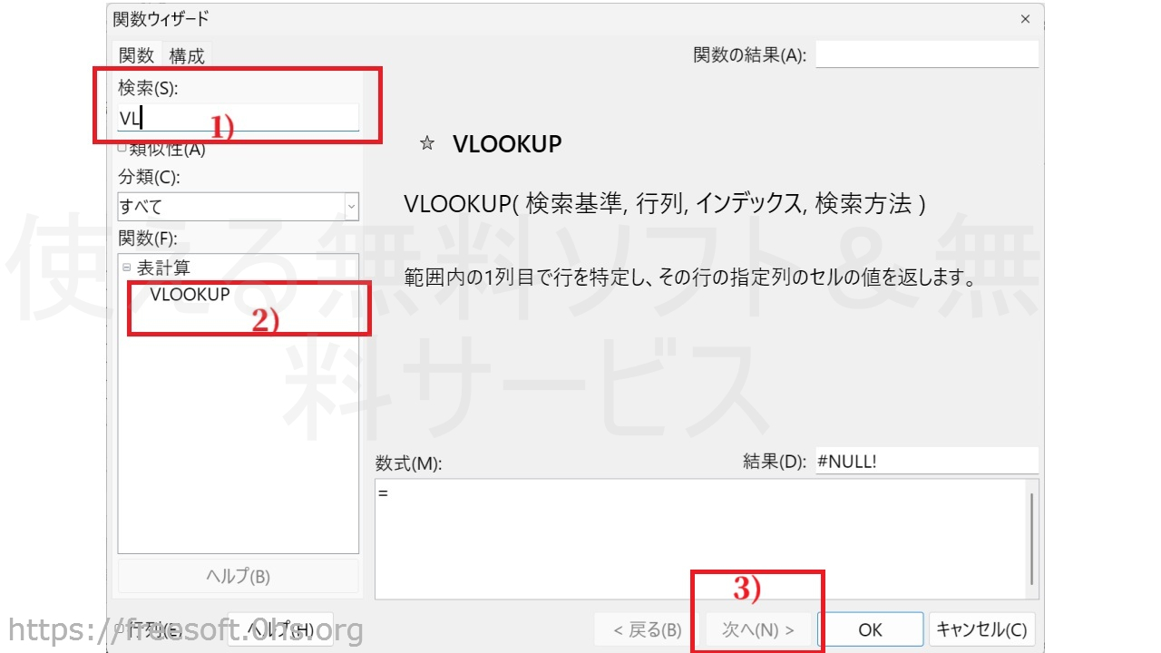 3.「関数ウィザード」の「検索」に【VLOOKUP】関数の頭文字「VL」を入力。