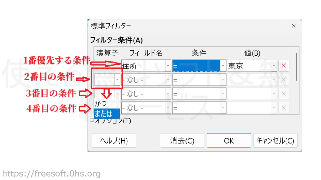 2段目からは「OR(または)」「AND(かつ)」を指定して絞り込む。