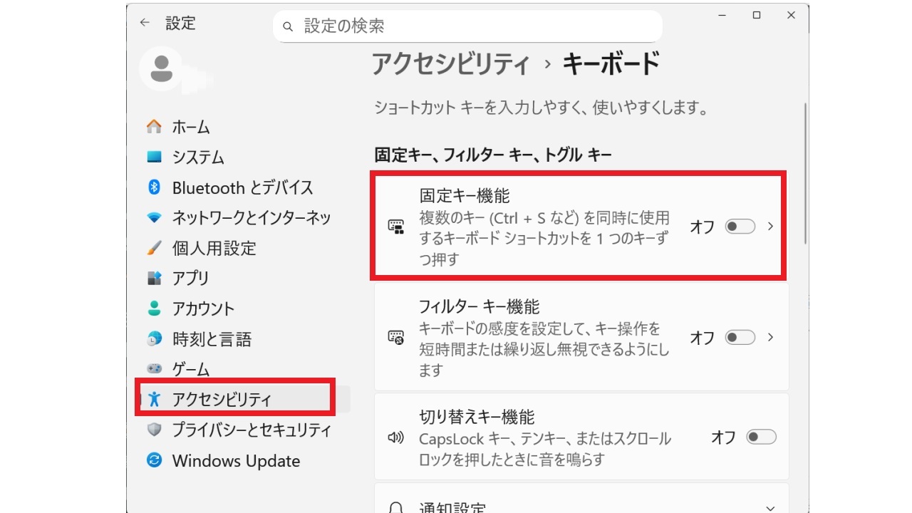 〔設定〕→〔アクセシビリティ〕→〔固定キー機能〕-固定キーの機能のON・OFF-Windows11