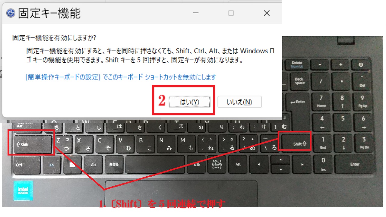Windows10、Windows11共固定キーの機能が解除する時は【Shift】キーを連続で5回押すと、固定キーが無効になる