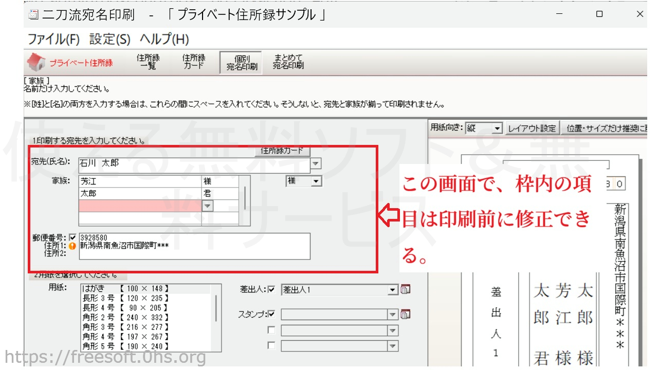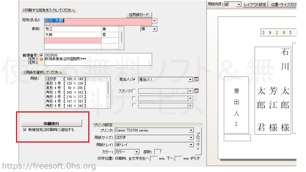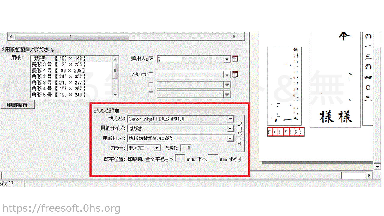 「二刀流宛名印刷」は、はがきや封筒に宛名を印刷できる無料ソフトだよ。
